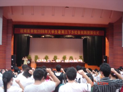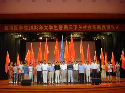 7月7日下午,我校大学生暑期三下乡出征仪式在校大学生活动中心隆重举行。校党委副书记郑勇超,校党委宣传部长李广福,校学生处长钱何珍、医学一系党总支副书记方国庆、医学二系党总支书记姜国年,医学三系党总支书记余海燕,护理学系党总支书记刘群,药学系主任吴少云,人文与管理系主任胡鸿、团委书记李军华以及各系团总支书记出席了本次出征授旗仪式。来自各系的暑期“三下乡”社会实践服务团500余名大学生志愿者参加了本次仪式。会议由校团委书记李军华主持并宣读《关于做好2008年暑期“三下乡”社会实践活动的通知》,医学三系06级口腔班肖梦超同学代表志愿者发言,人文与管理系06级学生王蕊同学带领全体志愿者宣誓。校党委副书记郑勇超在仪式上对所有的志愿者提出几点希望:一是进一步统一思想、提高认识,不断加大社会实践活动探索创新的力度。二是精心组织,狠抓落实。 三是深入群众、深入基层,服务社会。四是增强安全意识,培养团队协作能力和吃苦耐劳的优良品质,认真开展社会实践活动,真正做到受教育、长才干、作贡献。