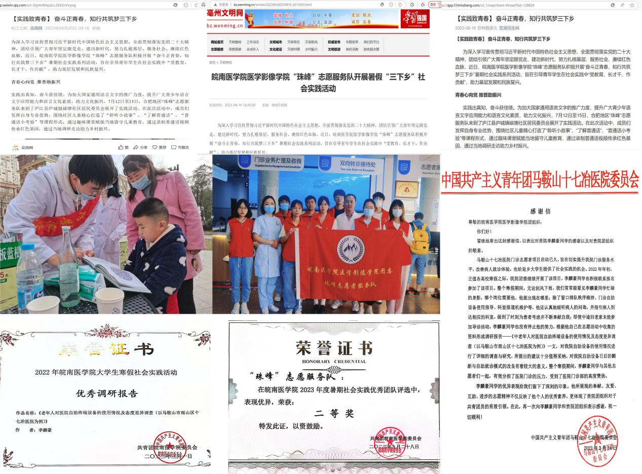 李麟豪积极投身寒暑假社会实践活动,带领“珠峰”志愿服务队成员在安徽省内开展一系列社会实践活动,并充分发挥专业优势,深入社区开展老年人护眼宣教及义诊等活动。此外,他还带领“珠峰”志愿服务队连续两年于寒暑假期间扎根马鞍山十七冶医院进行调研,形成调查报告反馈给医院,被医院采纳落地,受益患者累计万人,进一步提升了马鞍山地区中老年群体诊疗体验,获得医院表彰,获芜湖民生网、亳州文明网等多家媒体报道,同时也更加坚定了他好好学习、奉献社会的理想信念。