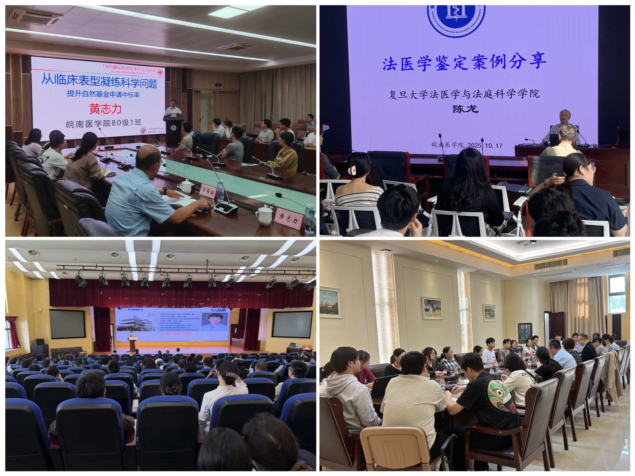复旦大学黄志力校友以“从临床表型凝练科学问题  提高基金申请中标率——青年学者成长之路”为题,面向学校国自然在研及申报人员分享科研思路与申报技巧,为青年学者科研成长支招。复旦大学陈龙校友聚焦“法医学鉴定案例分享”,通过真实案例解析,为法医学院师生搭建理论与实践的沟通桥梁,助力专业教学与实践能力提升。浙江大学罗本燕校友围绕“医院学科建设”主题,与我校附属医院各科室医护骨干深入研讨,从学科规划、人才培养等维度为医院学科发展建言献策。李幸芳校友则与药学院高层次人才及博士展开座谈,围绕学科前沿动态与科研合作方向交流探讨。