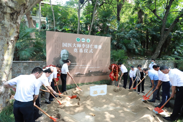 随后,在一附院沐风花园举行“国医大师”李济仁雕像奠基仪式。朱向明主持仪式,介绍了李济仁教授的生平与学术成就,并宣布奠基启动。领导专家共同为“国医大师”李济仁雕像培土奠基。