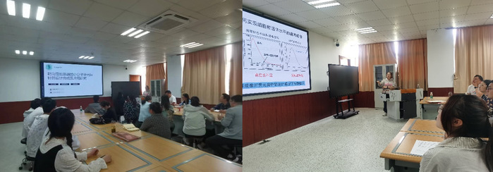 王慧博士以“靶向亚细胞器的小分子荧光探针的设计合成及应用研究”为题作学术报告。讲座中,她阐述了荧光探针的背景、意义,并详细介绍近期的研究成果,指出通过精心调节分子中不同基团及其结构,合成可用于靶向细胞膜、脂滴和溶酶体等不同细胞器的荧光探针,为相关临床疾病诊断提供实验基础。同时,利用脂滴和溶酶体作为切入点,成功开发了可用于识别和鉴定非酒精性脂肪肝的荧光探针。报告结束后,王慧博士和与会师生进行了深入探讨。整场讲座内容丰富生动,引人入胜,给与会者留下了深刻印象。