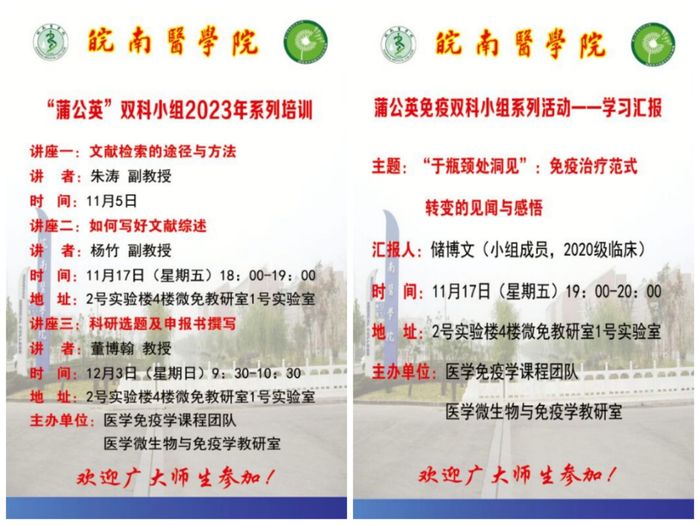 为丰富学生第二课堂形式和内容,切实提升蒲公英免疫双科小组成员的科研素养,医学免疫学课程团队于近期陆续开展了科研指导教师系列专题培训和蒲公英小组代表学习汇报,持续推进国家级一流课程建设。