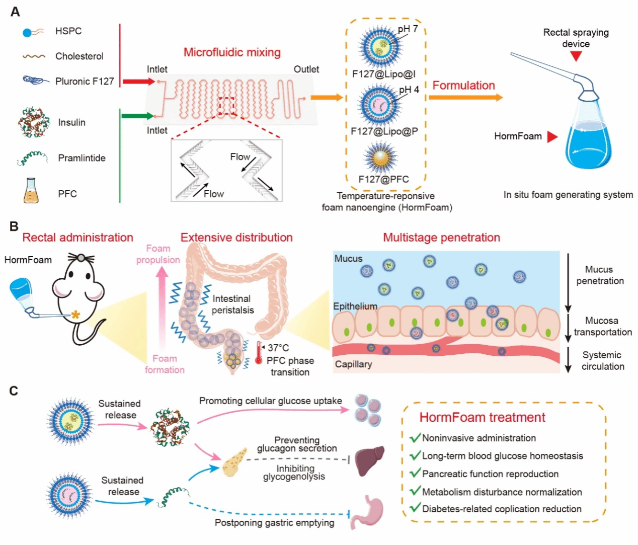 该研究提出了一种创新的温敏双激素泡沫纳米引擎(HormFoam),旨在提高糖尿病治疗中胰岛素和普兰林肽的有效性。研究团队运用微流控技术开发了一个连续泡沫生成系统,将功能化脂质体与全氟化碳纳米液滴相结合,通过微流控芯片实现了高效组装。HormFoam在直肠给药后,可在生理温度下持续生成泡沫,促进药物在肠道内的扩散并增强其粘膜吸收。实验结果显示,HormFoam能够模拟胰腺的内分泌功能,显著改善糖尿病小鼠的血糖控制,减少体重增加并缓解代谢紊乱,同时展现出良好的生物安全性。该研究为糖尿病的双激素治疗提供了一种新的高效递送策略,具有显著的临床应用潜力。(高彦峰/文、图)