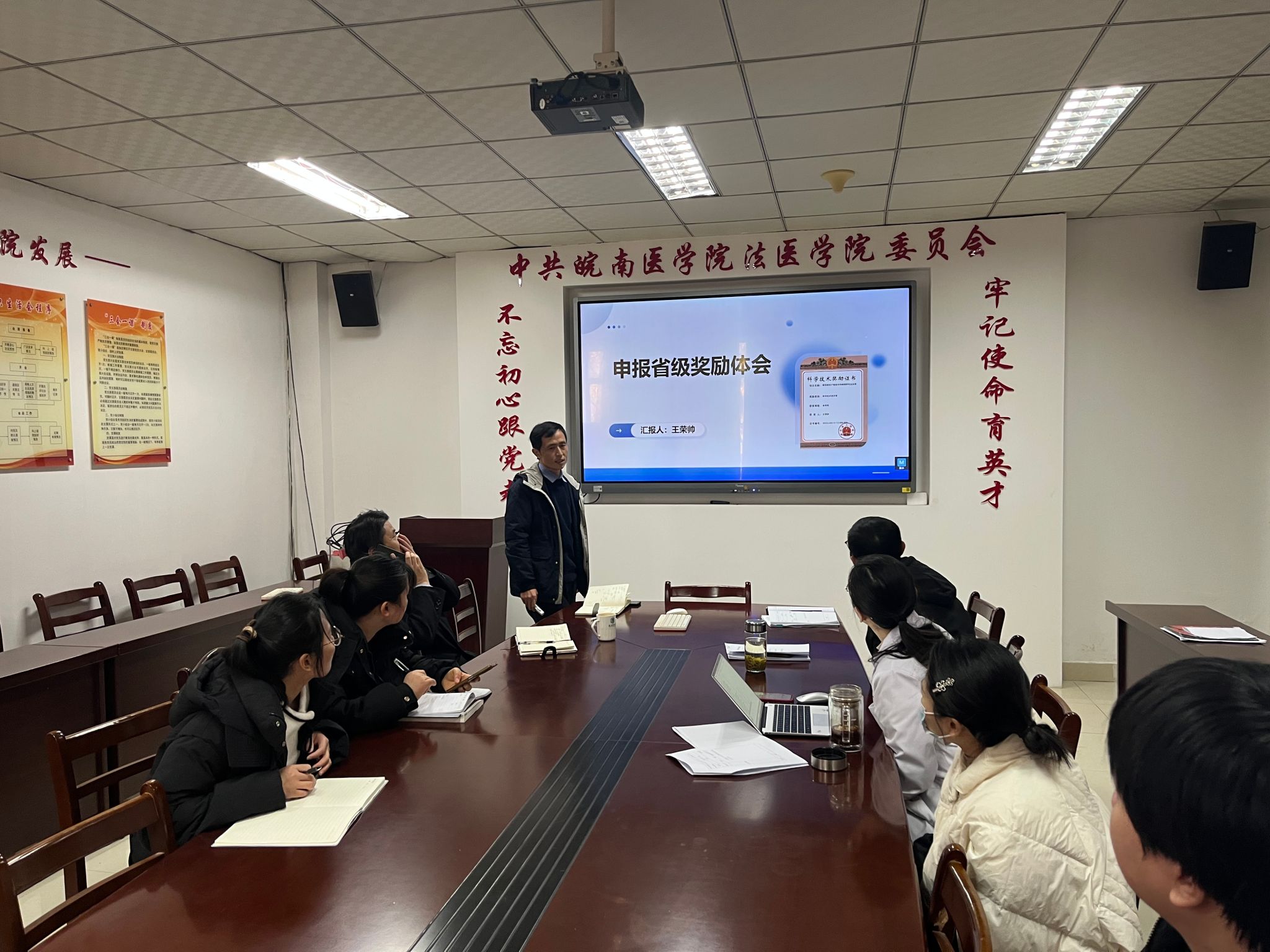 会上,徐祥传达了学校关于本次申报工作的具体要求,解读了安徽省科技奖申报指南的细则。王荣帅以“‘新冠肺炎尸检技术和病理研究及应用’项目申报的工作流程”为主题,从项目申报类别选定、前期材料准备到申报注意事项等方面,全面细致地阐述了科学技术奖励申报的全过程,为拟申报项目的教师提供了宝贵经验。